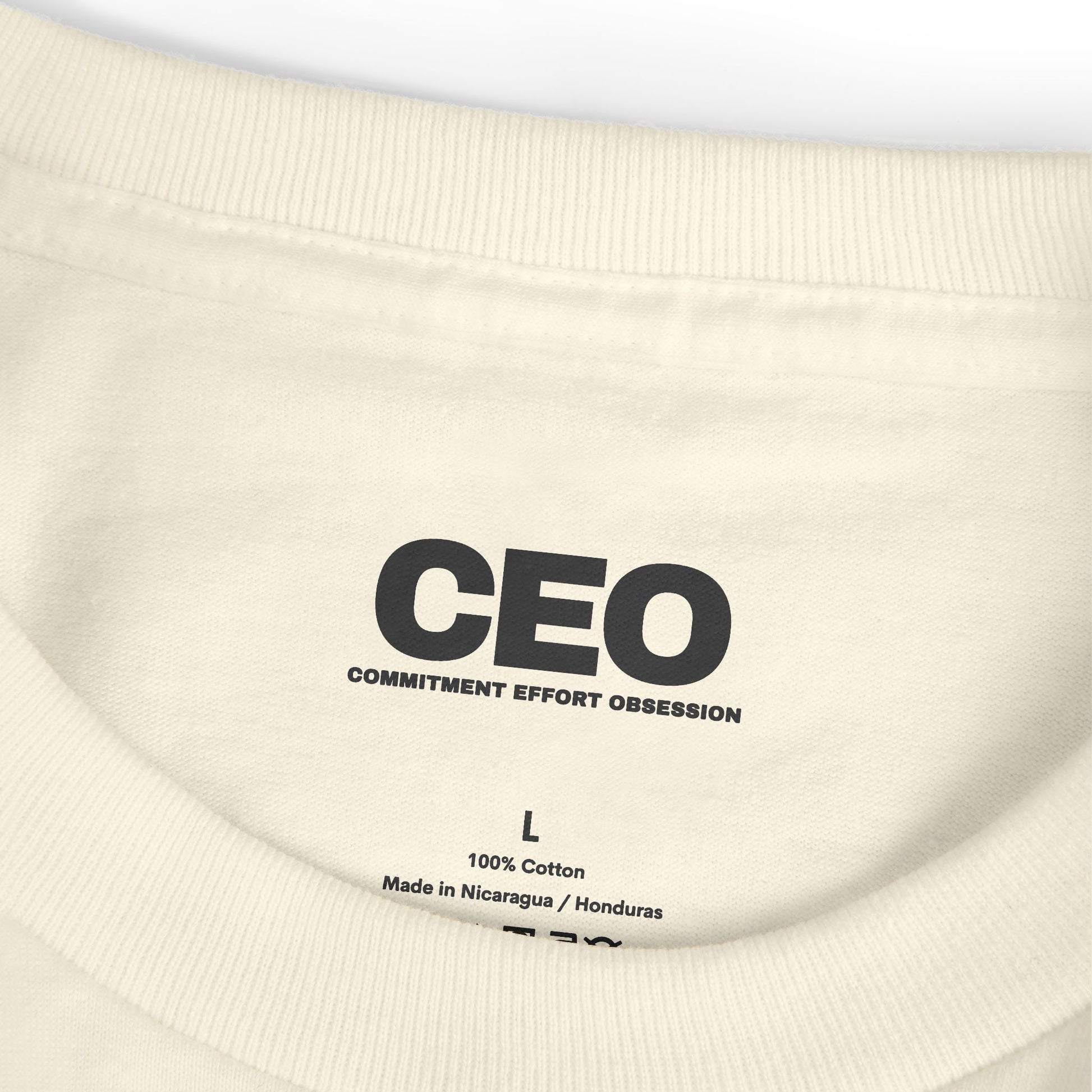 A heavyweight cotton tee that reads like a quiet manifesto. The soft, garment-dyed fabric carries a lived-in, vintage tone while the small, minimalist front print—COMMITMENT · EFFORT · OBSESSION—speaks to focused routines and quiet ambition. It sits relaxed on the body with a wide rib collar and taped shoulders for structure that lasts. Wear it to anchor a minimalist wardrobe, to layer under a jacket during late-night work sessions, or as a subtle reminder on days when you need to push through. The natural, muted color and tear-away label keep the feel clean and intentional, while sustainable and socially conscious production means the shirt arrives with a clearer conscience.